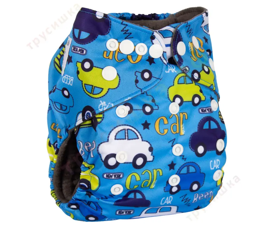 Классический многоразовый подгузник на кнопках Трусишка с внутренним слоем из угольно-бамбукового фибра и защитными бортиками от протекания.