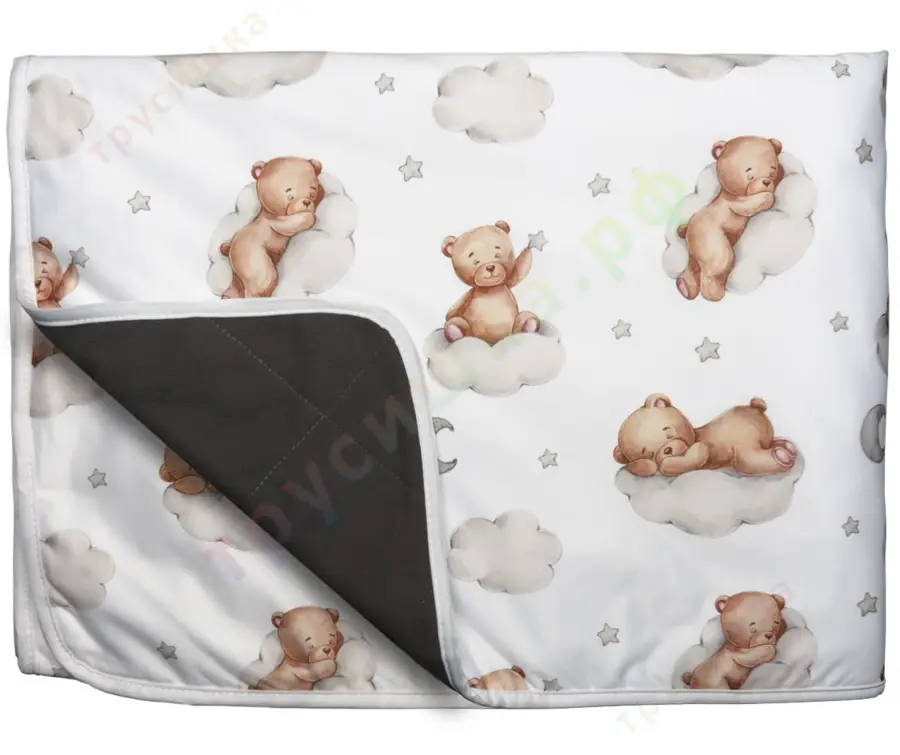 Важно! Ребеночка нужно класть на однотонную серую сторону, именно она впитывает жидкость! Сторона с принтом не впитывает жидкость, ее можно использовать в качестве клеенки или коврика для игр.